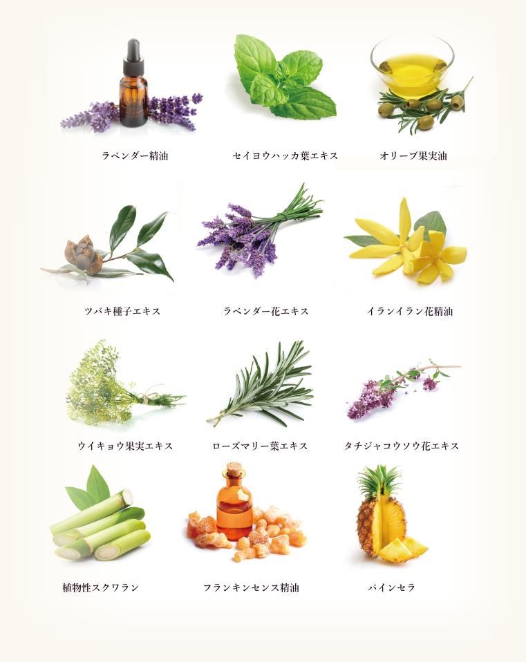 ラベンダー、フランキンセンス、イランイランの3種の天然アロマオイルだけを使用しています。(化学的な香料は一切使用しておりません)